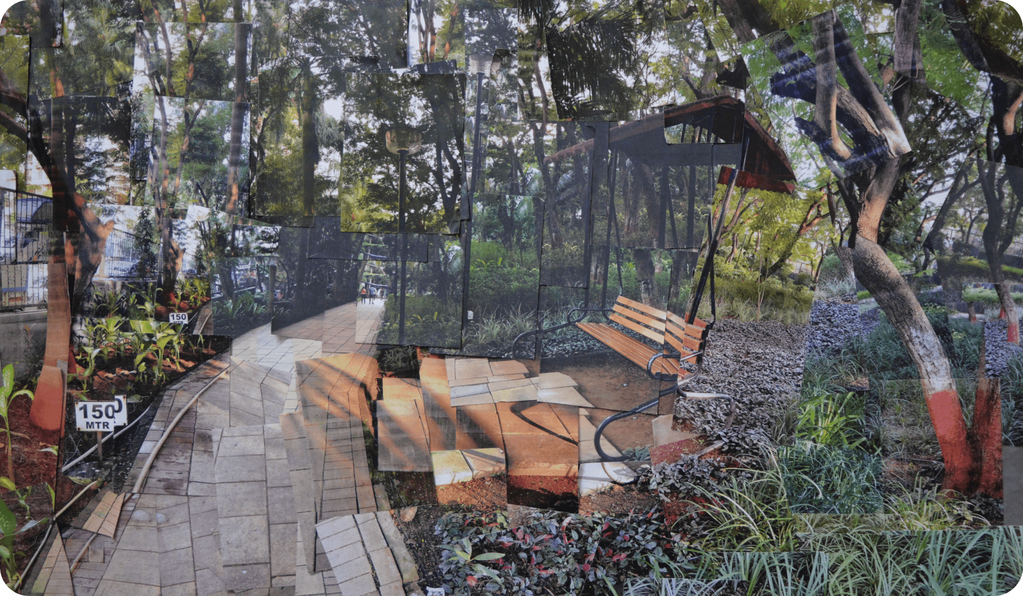 The purpose of this exercise was to bring about the contrast between the perceived three dimensionality of the world we see and the usual two dimensionality of a photograph by making a composition inspired by David Hockney’s work . The strange three dimensionality of a space is uniquely perceived by everyone and hence we used contour drawing to understand the relation between what we see through our stereoscopic vision and it’s direct representation into a two dimensional live , continuous line drawing . We had to learn Hockney’s visual language by choosing the correct space , using it’s elements such as parallel lines and contrasting colours/forms to our advantage such that it formed a discontinuous yet continuous composition as a whole . The use and translation of the contour drawing into the composition is highlighted through the last iteration .